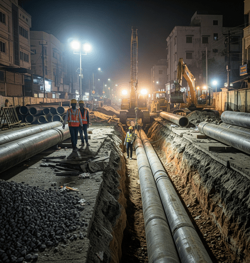 NTC Infra is undertaking a key sewage infrastructure upgrade in Chennai by replacing the existing 1000 mm DI pumping main with two parallel 900 mm CI mains, spanning 6,135 meters from LB Road Relay SPS to Perungudi SPS. This project is strategically designed to enhance sewage flow capacity, introduce operational redundancy, and improve the overall reliability of the city's core wastewater system. With a focus on precision, durability, and long-term performance, the initiative reflects NTC Infra’s commitment to building smarter, more resilient urban infrastructure.